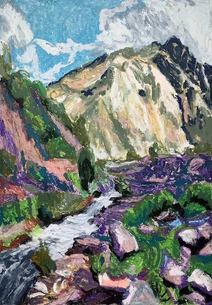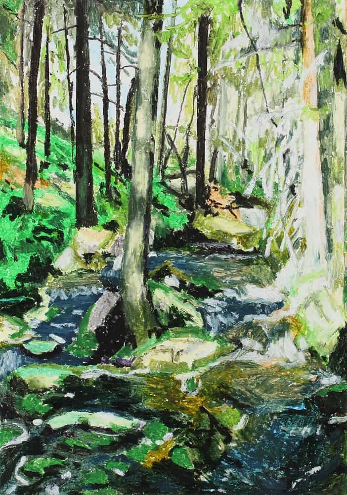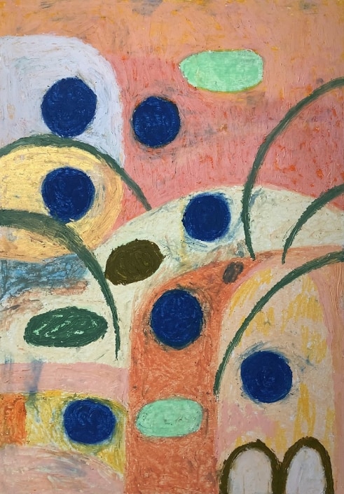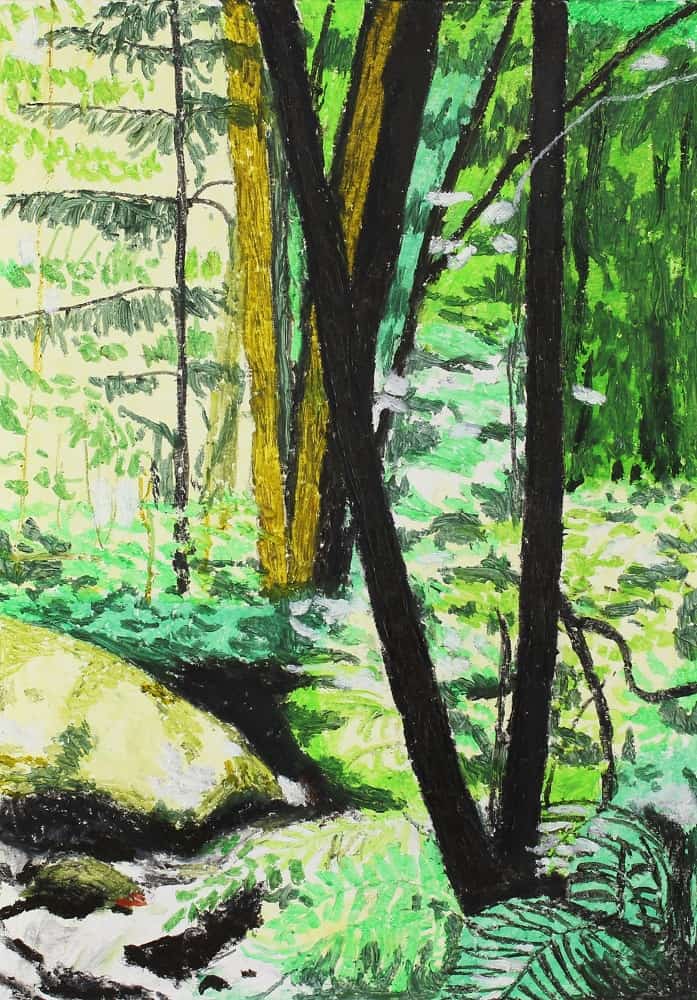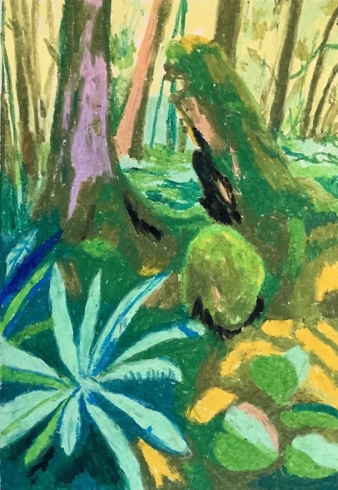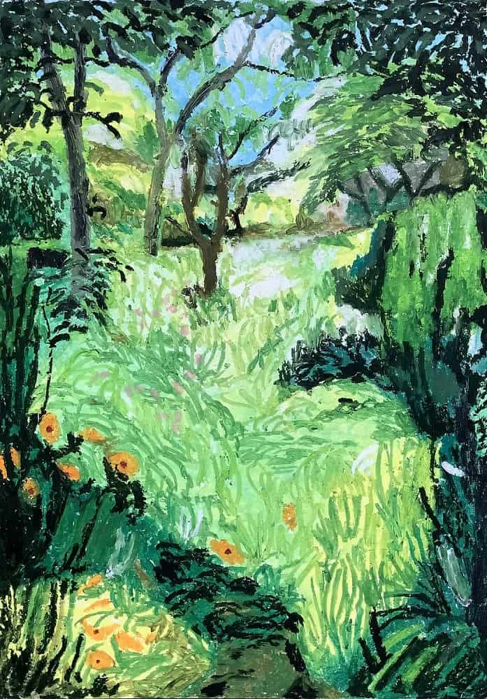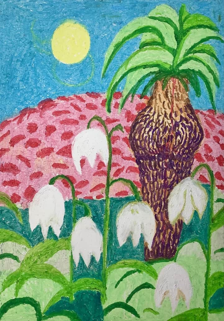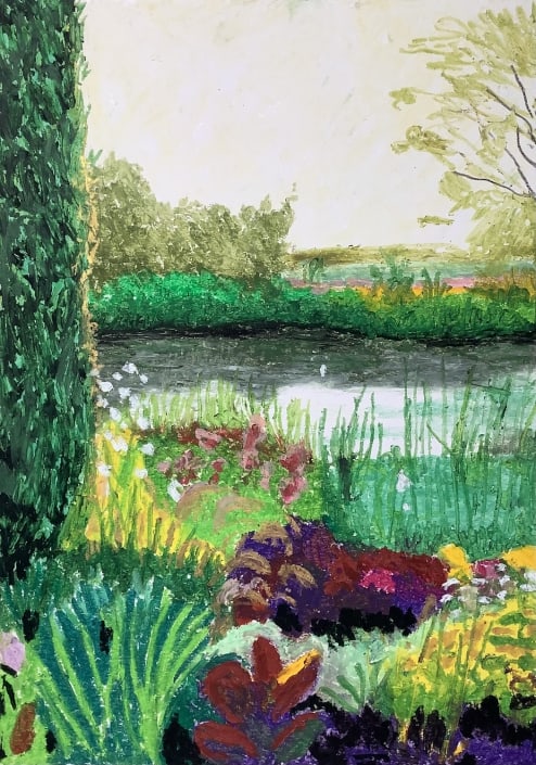 I made this series of 101 oil pastel drawings during the Covid19 lockdowns in The Netherlands in 2020 and 2021. They are playful, over the top, reflecting how we see nature as modern human beings. The series is like a happy parody on the human longing for paradise; our idea that being elsewhere is better than being here and now. Landscapes, sunrises, full moons, garden ponds, and flamingos; everything is possible in these drawings and that’s what makes them so much fun.